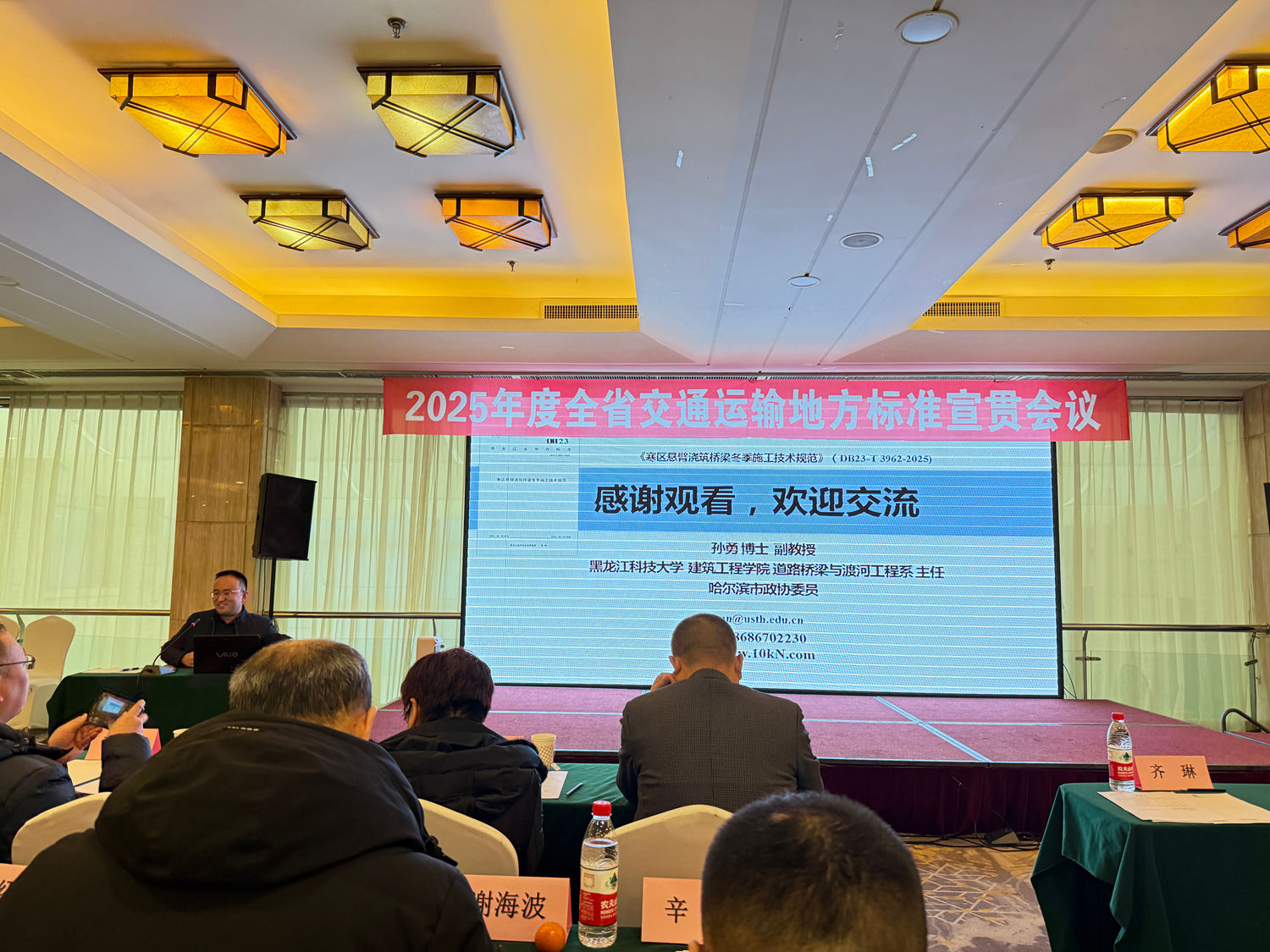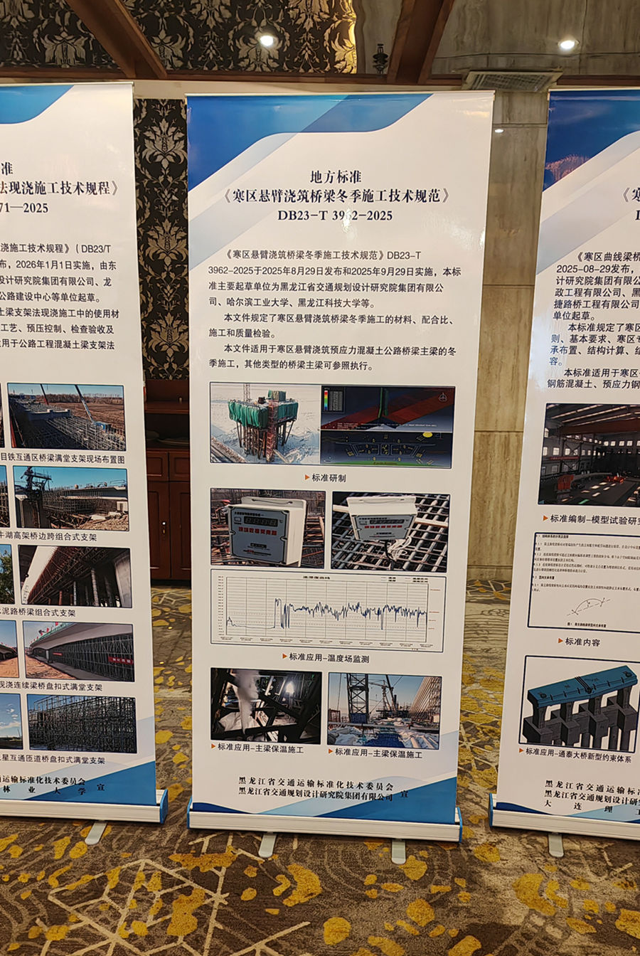 2025年12月9日,由黑龙江省交通规划设计研究院集团有限公司、哈尔滨工业大学、黑龙江科技大学等多家单位共同编制的《寒区悬臂浇筑桥梁冬季施工技术规范》(DB23-T 3962-2025)参加了由黑龙江省交通运输专业标准化技术委员会(简称“专标委”)组织的2025年度全省交通运输地方标准宣贯会议。会上,黑龙江省交通运输厅科技教育处一级调研员于耀斌发表了讲话,孙勇老师代表标准编写组向全省交通领域同行进行了宣贯。