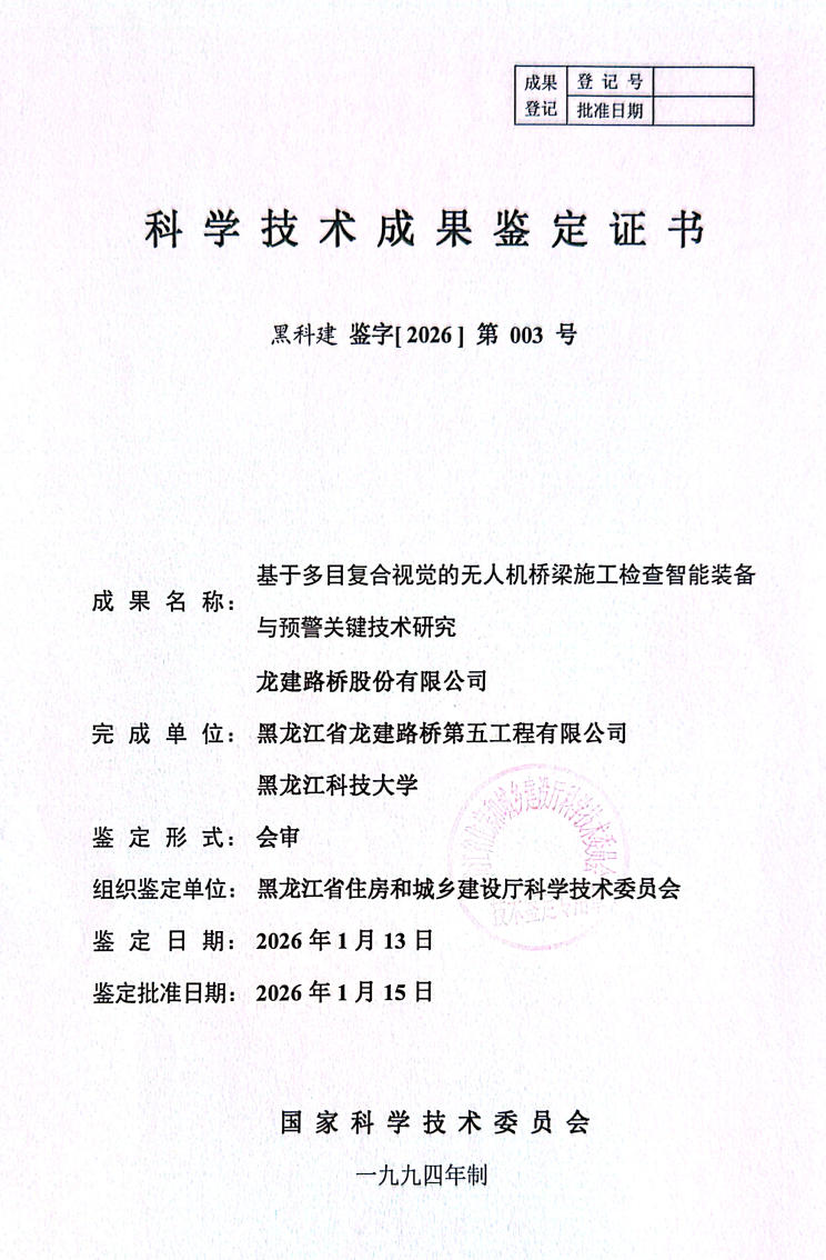 2026年1月13日,由龙建路桥第五工程有限公司与黑龙江科技大学合作完成的课题《基于多目符合视觉的无人机桥梁施工检查智能装备与预警关键技术》鉴定会在龙建股份有限高公司举行,黑龙江省住建厅组织了专家组对对课题进行了鉴定。鉴定会上,赵冶等课题组相关人员汇报了课题研究工作报告、技术报告、研究总报告、查新报告等有关内容,并通过了专家们的现场查询。该项目中,孙勇为项目负责人。