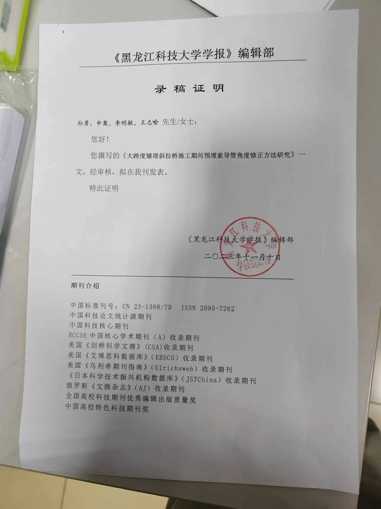 课题组的论文《大跨度矮塔斜拉桥施工期间预埋索导管角度修正方法研究》收到了《黑龙江科技大学学报》发来的稿件录用通知,已确认被录用,祝贺相关同学!本文作者为孙勇、申奥、李明敏、王志喻(期刊要求导师为第一作者),论文内容围绕佳木斯松花江特大桥项目展开,具有一定的学术价值和工程应用价值。
