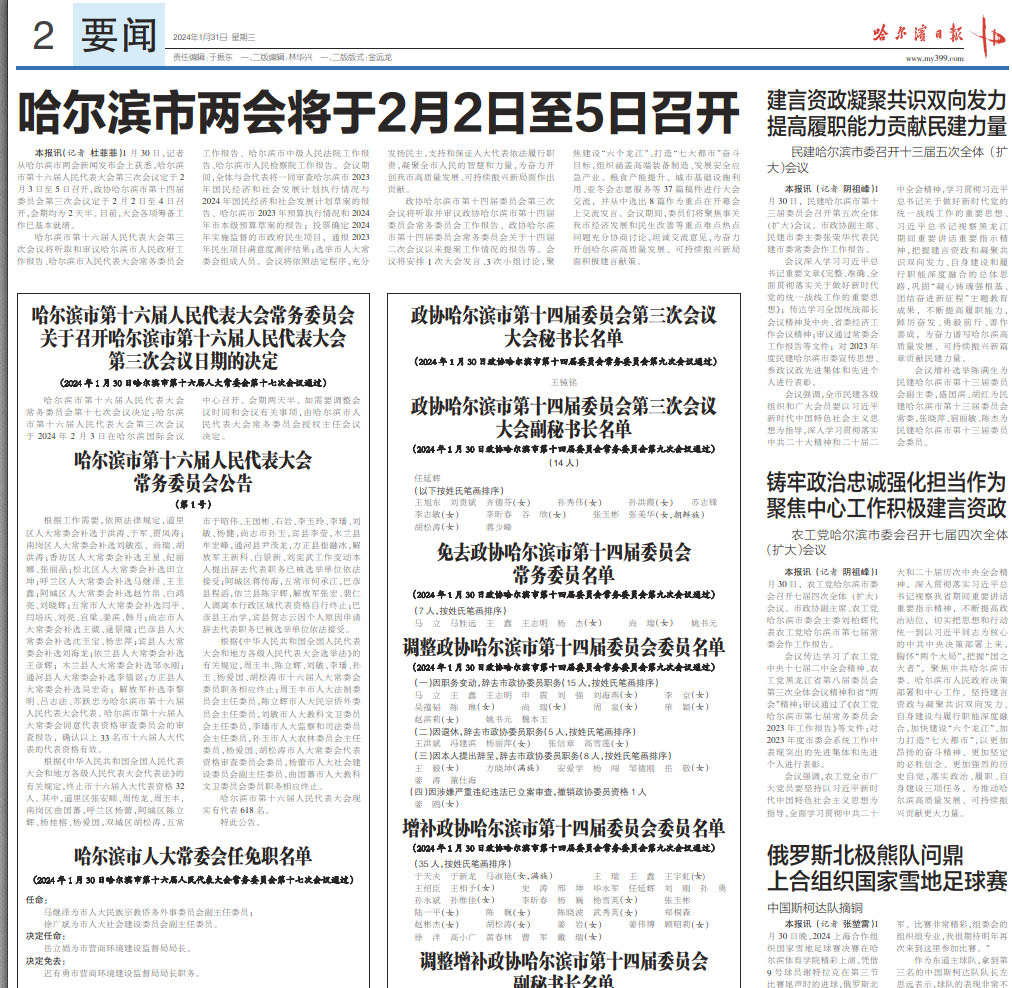 2024年1月31日政协哈尔滨市委员会发布《增补政协哈尔滨市第十四届委员会委员名单》,孙勇老师当选为委员。2月2日-4日,孙勇老师以哈尔滨市政协委员身份,参加中国人民政治协商会议哈尔滨市第十四届委员会第三次会议。“两会”期间,孙老师以饱满的政治热情参加了各项活动,小组讨论中积极发言,献计献策,并提交了《关于加强推动哈尔滨历史文化建筑活化利用营商环境建设,强化“浪漫内核"助力“创意设计之都"的建议》提案。