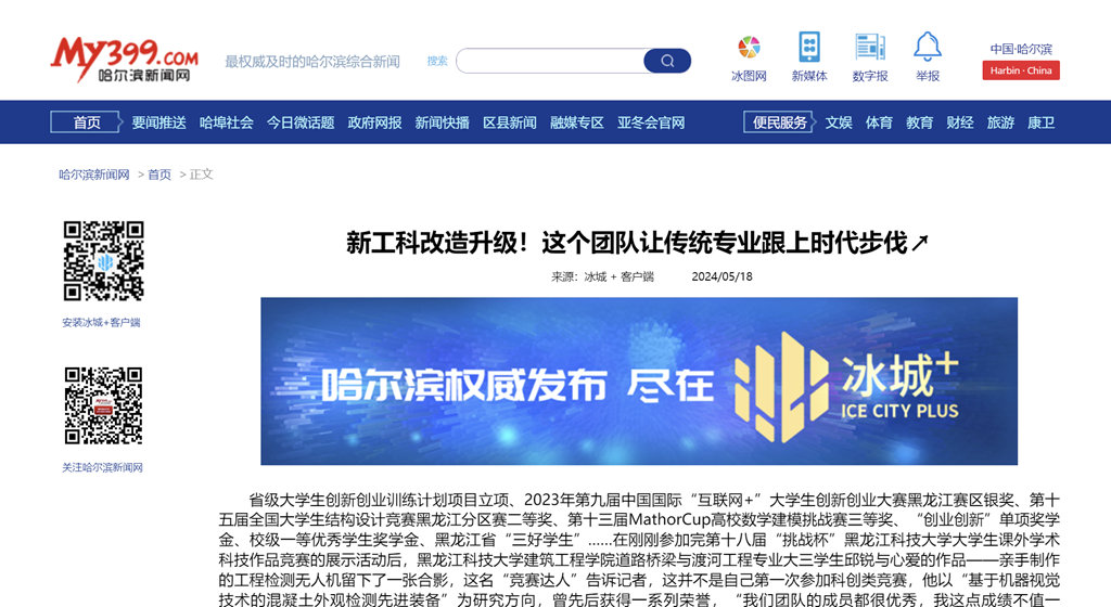 5月18日,以“新工科改造升级!这个团队让传统专业跟上时代步伐”为题,iBridgeLab本科生大创团队被哈尔滨新闻网哈尔滨市融媒体中心官方平台“冰城+”报道,报道链接:https://www.my399.com/p/339904.html